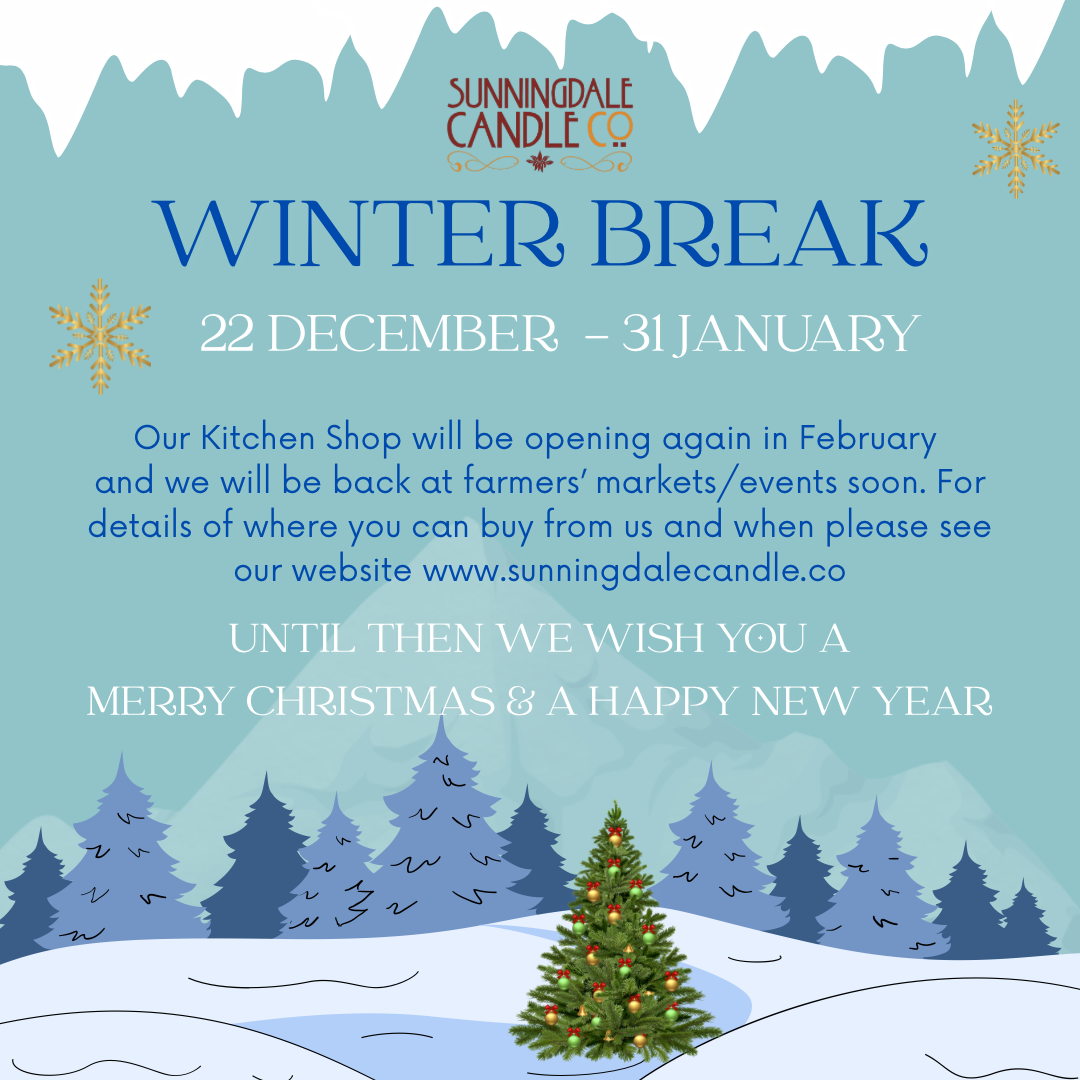 WINTER BREAK Sunday 21 December 2025 11:59 pm 23:59 Saturday 31 January 2026 11:59 pm 23:59 Sunningdale Candle Co 11 Galton Road Sunningdale, Ascot, SL5 0BP (map) Google Calendar ICS